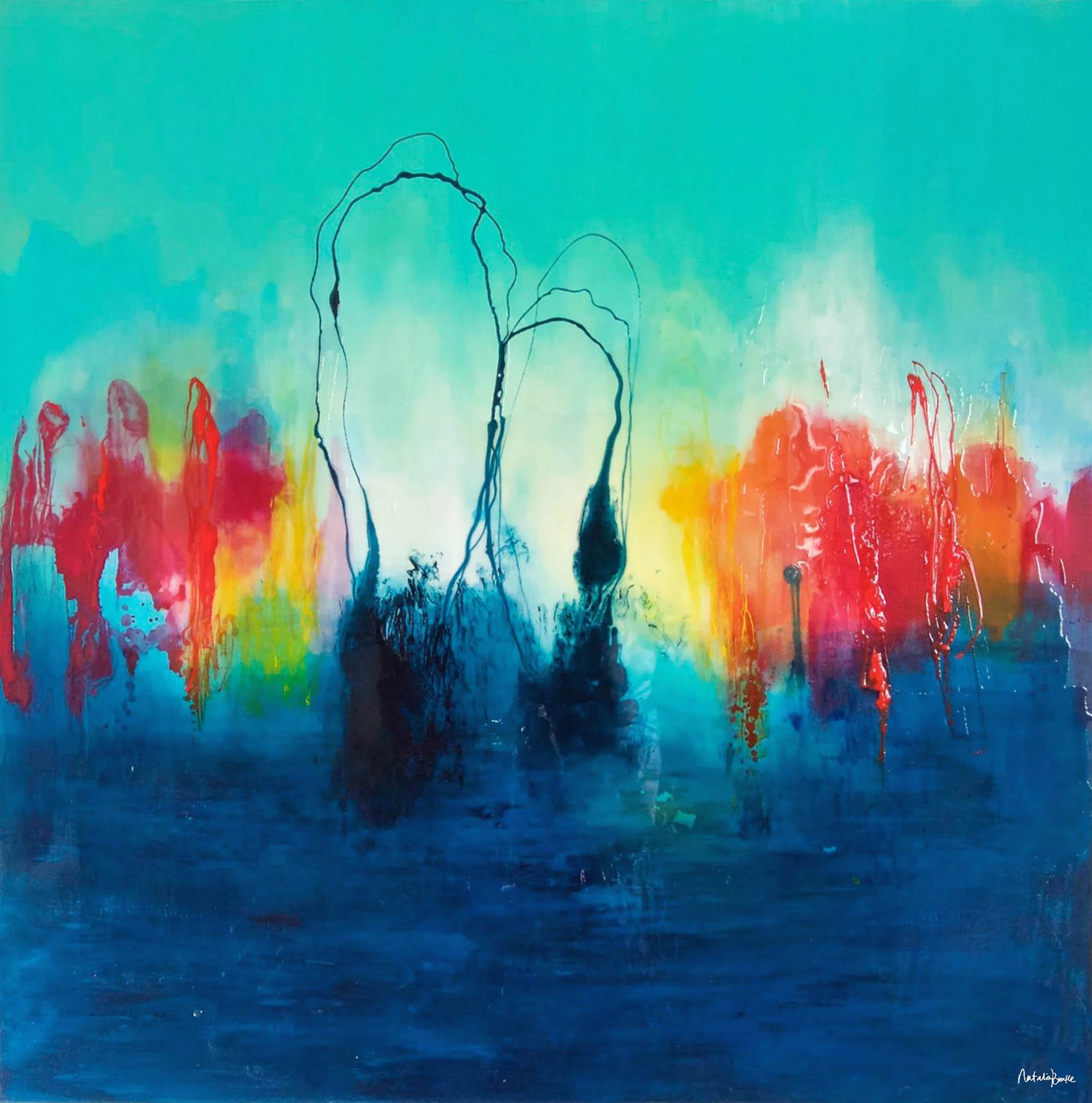 Commission for a private collector in Victoria, BC. This couple was expecting their first child and wanted to bring some visual warmth into their living room before the babe arrived. They gave some indications on style and colour preferences and I created this piece based on those indicators. We were all very happy with the end result.